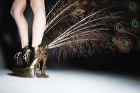 串野さんの新作、ピーコックにも驚き。テキスタイルデザイナー、今井美沙さんが創る、デザインにあったオリジナルのテキスタイルが使われている。孔雀の羽やヒールにぱっと目を奪われるが、よく見ると、地模様のテキスタイルによって、幻想的な孔雀ワールドがより強化されている。