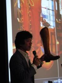 山口さんは5000年前の靴の話に始まり、革のすぐれた特性、人間の足の構造、靴と足の不思議な関係など、基本的な事柄に見えて案外知らない靴のお話を丁寧に解説。「足の形のまま靴を作ると、実はゆるい」という意外な事実。人間の足には56個もの骨があること。「履くときにはすっと抵抗なく履けなくてはいけないが、いったん履いてしまうと脱げては困る」というパンプスの不思議。「自分に合った一足」を見つけることの大切さを学ぶ。写真はオーダーメイドのブーツを手に講義する山口さん。