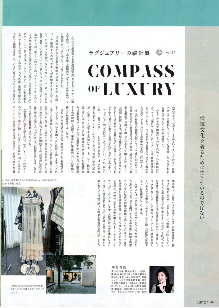 Culture, Art, Music and History / 美術、カルチュア、音楽、ヒストリー Essay / エッセイ Fashion / ファッション Luxury Studies prevnext 「ラグジュアリーの羅針盤」Vol. 17 きもの「やまと」パリ進出 2024年3月29日北日本新聞「ゼロニイ」連載「ラグジュアリーの羅針盤」Vol. 17。きもの「やまと」のパリ進出について、社長の矢嶋孝行さんにインタビューした記事です。 伝統文化に高い価格をつけて売る、という最近の風潮に矢嶋さんは抵抗します。「文化を楯にしたくはありません。私たちは伝統文化を着るために生きているのではありません。着たいと思ったものが文化になっていく」という言葉にはっとさせられます。 ほぼ一週間後、ウェブ版にも掲載されます。同時にnoteで英語版を掲載します。 2024年3月29日/0 コメント/作成者: Kaori https://www.kaori-nakano.com/wp-content/uploads/2024/03/compassyamato20240329_04461520.jpg 2322 1653 Kaori http://www.kaori-nakano.com/wp-content/uploads/2021/06/logo-1.png Kaori2024-03-29 05:01:502024-03-29 05:01:50「ラグジュアリーの羅針盤」Vol. 17 きもの「やまと」パリ進出