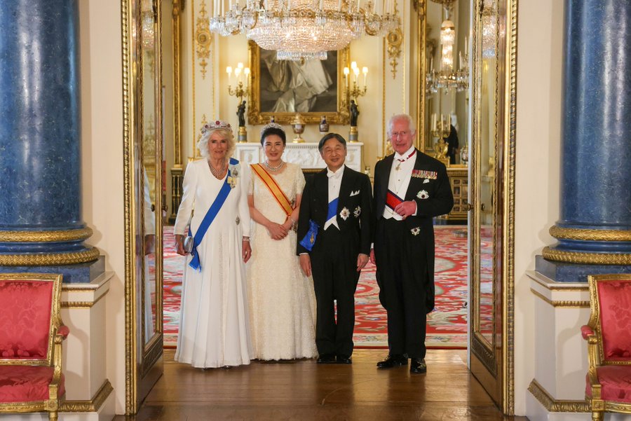 カミラ王妃は、お気に入りデザイナーのひとり、フィオナ・クレアの白いドレスでしたが、ティアラで日本の国旗、紅白を表現して敬意を表した…というところでしょうか。それにしても今年の外交場面、白が本当に多い。