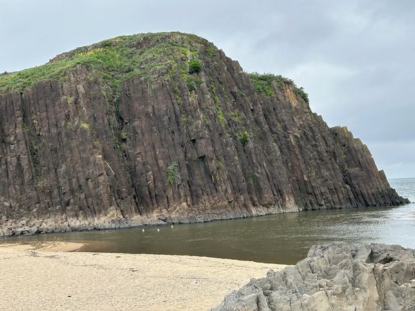 まずは「立岩」。高さ約20mの一枚岩です。地下から上昇してきたマグマが固まり、その後の侵食により周囲の岩石が削り取られてこの岩が残されたといいます。
