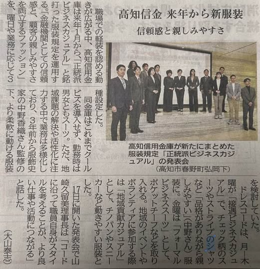 ・そのために、ビジネスウェアの基本の組み立て方、各場面での仕事に対する向き合い方、それにふさわしい服を選択するときの美意識と知識の養成など、あらゆる方面にわたり研修を重ねてきました。春夏、秋冬、各3日間にわたる研修と受注会(加えて一日の新人研修)で、職員260名一人一人にあったオーダースーツ、オーダービジカジをご提供してきました。ディレクションと研修を私が担当し、尾張一宮の国島が現場を統括してきました。スーツ制作にかかる莫大な費用に関しては高知信用金庫が大部分を補助しています。職員は平均して一年に3~4着、スーツやビジカジセットアップを新調していることになります。マドラスとのコラボでオリジナルビジネスシューズも開発、チクマとのコラボでオリジナルスーツインナーも開発しました。そのワードローブ構成の蓄積があって、3つのドレスコードに関する今回の記者会見となったわけです。ただの「ビジカジやります」会見ではないのです。