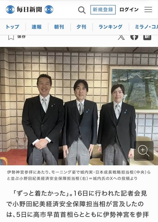 本日の毎日新聞(有料記事)「小野田紀美氏が投じた一石 専門家も驚いたモーニング姿」