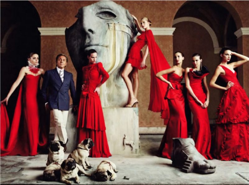 彼の作品世界には常に構築と儚さの対話があります。精密に設計されたラインの上に、呼吸をするように揺らめくシフォンやオーガンザ。そこには建築的論理と感情的詩情が共存しています。そして何よりも象徴的なのが、彼自身が「唯一、女性を真に照らす色」と呼んだヴァレンチノ・レッド。深く華やかな赤は、情熱ではなく品格の炎として、時代を越えたアイコニックな色となりました。