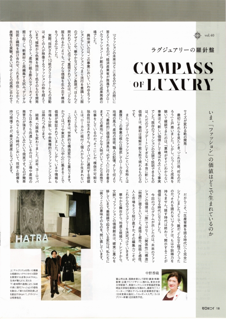 Works / 仕事 prevnext ラグジュアリーの羅針盤 ファッションの価値はどこで生まれているのか? 2026年2月27日北日本新聞「ゼロニイ」発行されました。連載「ラグジュアリーの羅針盤」Vol. 40。 いま、ファッションの価値はどこで生まれているのか? 多角的に考えさせられるイベントの所感を書いております。 写真は、アルゴリズムを用いた複雑な組織をもつテキスタイル設計を展開するHATRA。 2026年2月27日/0 コメント/作成者: Kaori https://www.kaori-nakano.com/wp-content/uploads/2026/02/compassofluxuryvalueoffashion20260227_18504644-scaled.jpg 2560 1811 Kaori http://www.kaori-nakano.com/wp-content/uploads/2021/06/logo-1.png Kaori2026-02-27 18:57:382026-02-27 18:59:15ラグジュアリーの羅針盤 ファッションの価値はどこで生まれているのか?