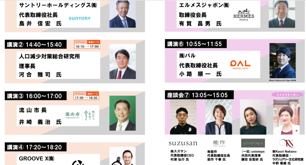 サントリーホールディングス代表取締役社長の鳥井信宏さま、エルメスジャポン会長の有賀昌男さまはじめ、各界のリーダーの方々が講演をされます。
