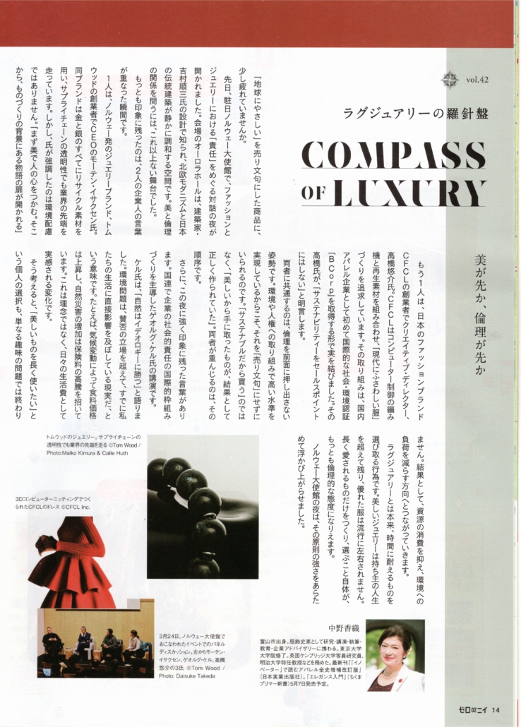 北日本新聞別冊「ゼロニイ」が発行されました。連載「ラグジュアリーの羅針盤」Vol. 42では、ノルウェー大使館で開催された、ファッションとジュエリーにおける「責任」をめぐる対話を聞いて考えたことを書いています。