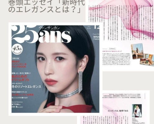 25ans 12月号に寄稿した新時代のエレガンス論。2025年度、45周年を記念して巻頭で展開されたリレーエッセイシリーズですが、とても光栄なことに、そのアンカーを務めさせていた…