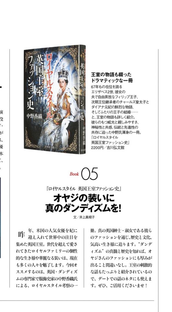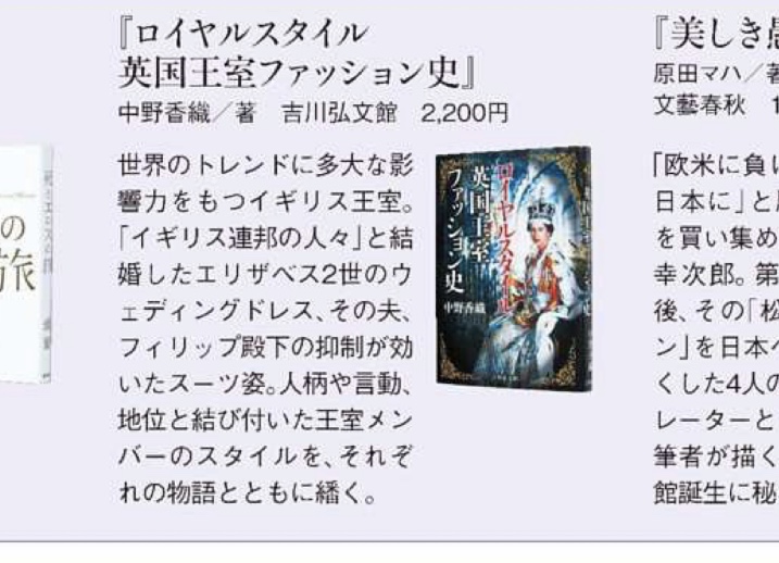 「服装だけに終始した薄っぺらなお洒落指南書でもない。かといって小難しくて退屈な英国王室研究書でもない。人間愛に溢れたエッセイスト中野香織さんらしい、ちょっとためになる(スタイルについて考えさせられる)エンターテイメント」 ←このまま帯のコピーにしたいくらいのありがたさです。